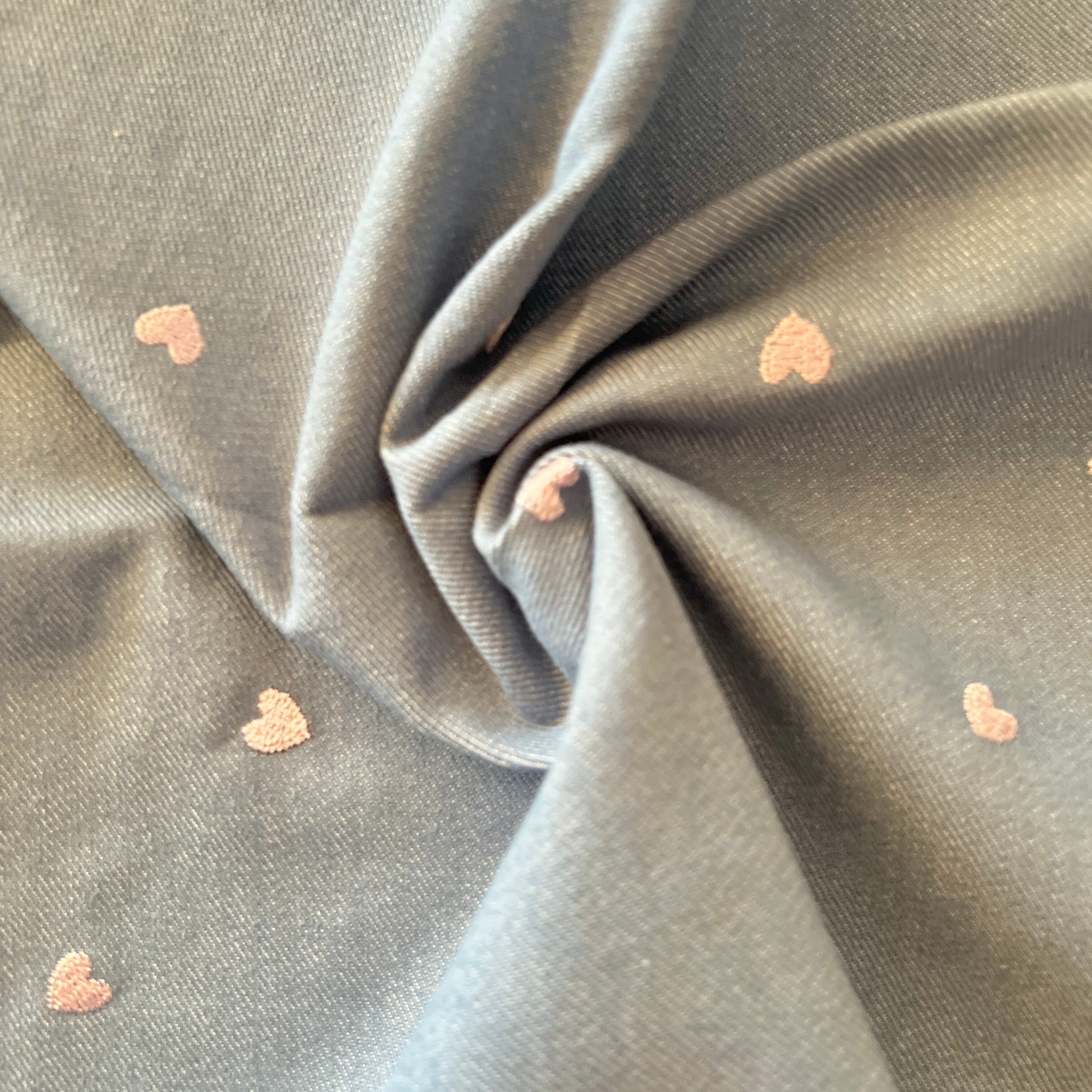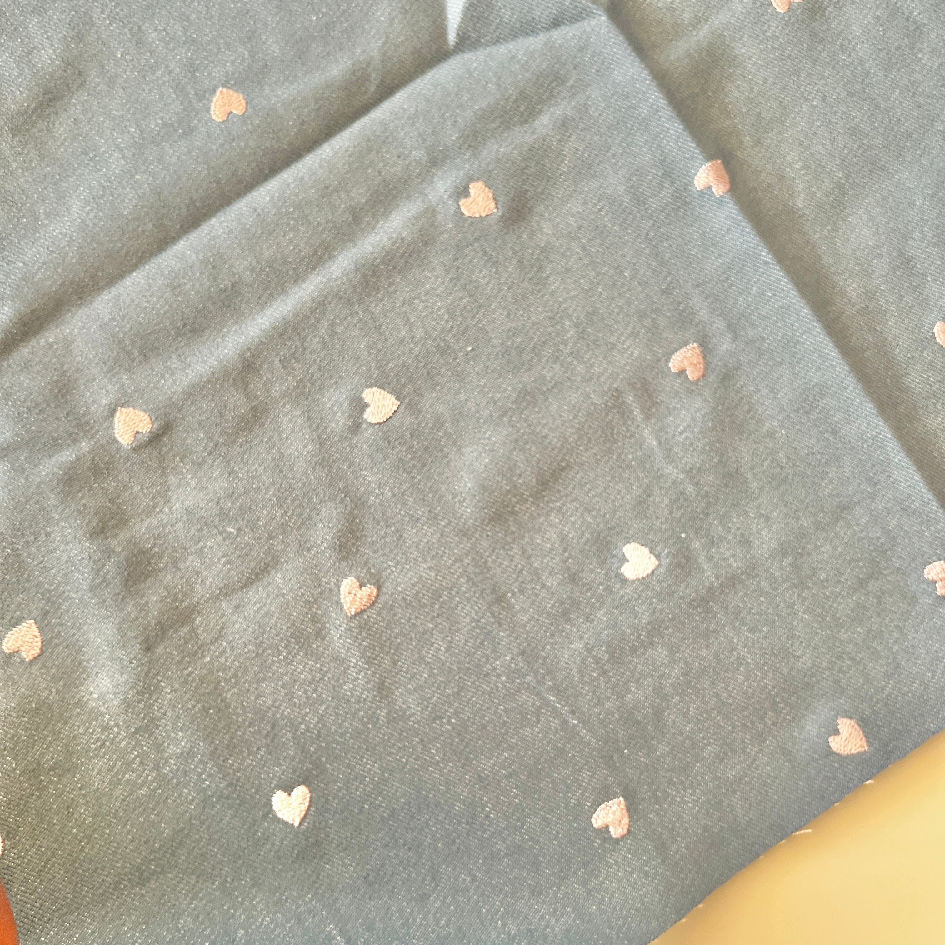 定番のデニム生地にオリジナル刺繍のミニハート刺繍を施した生地です。