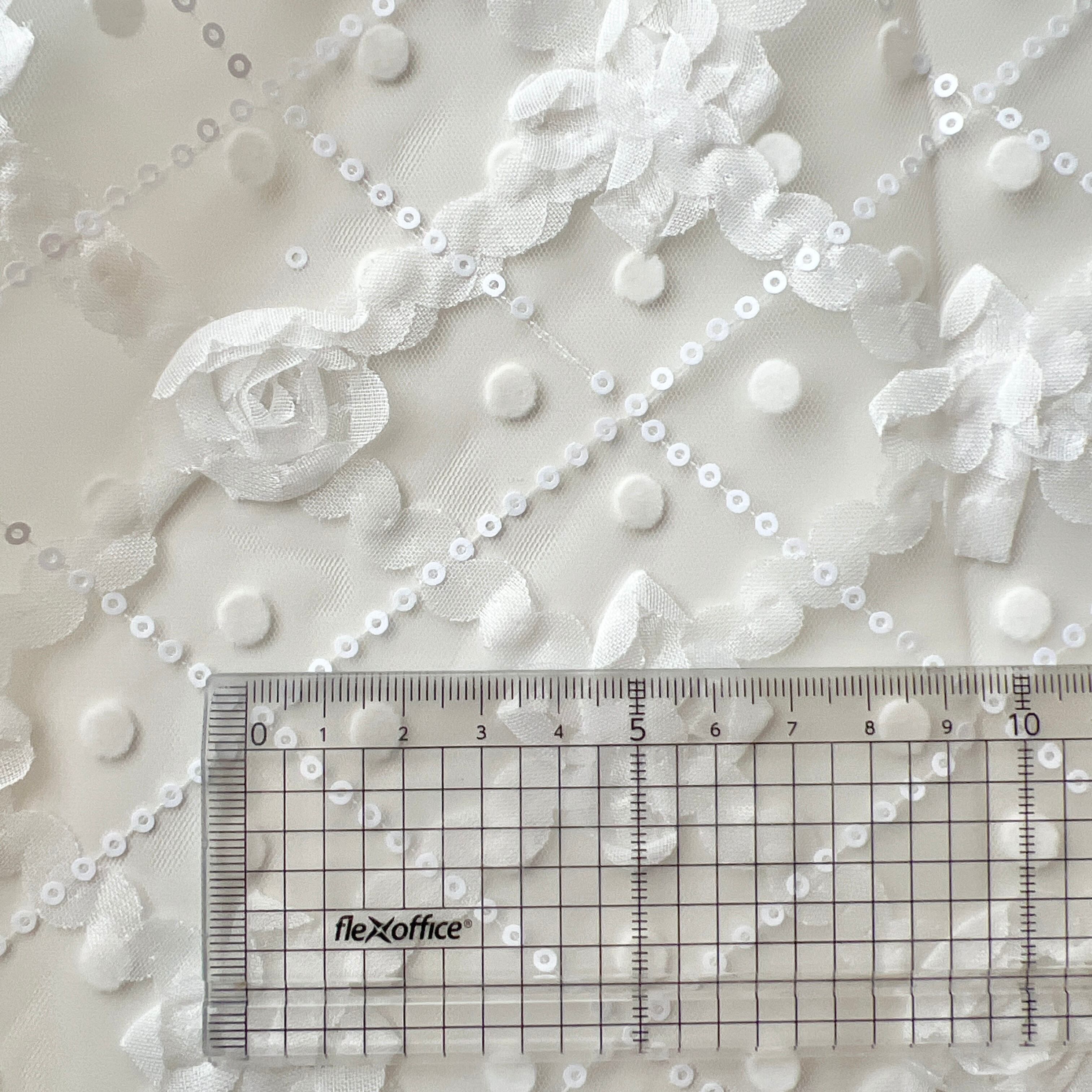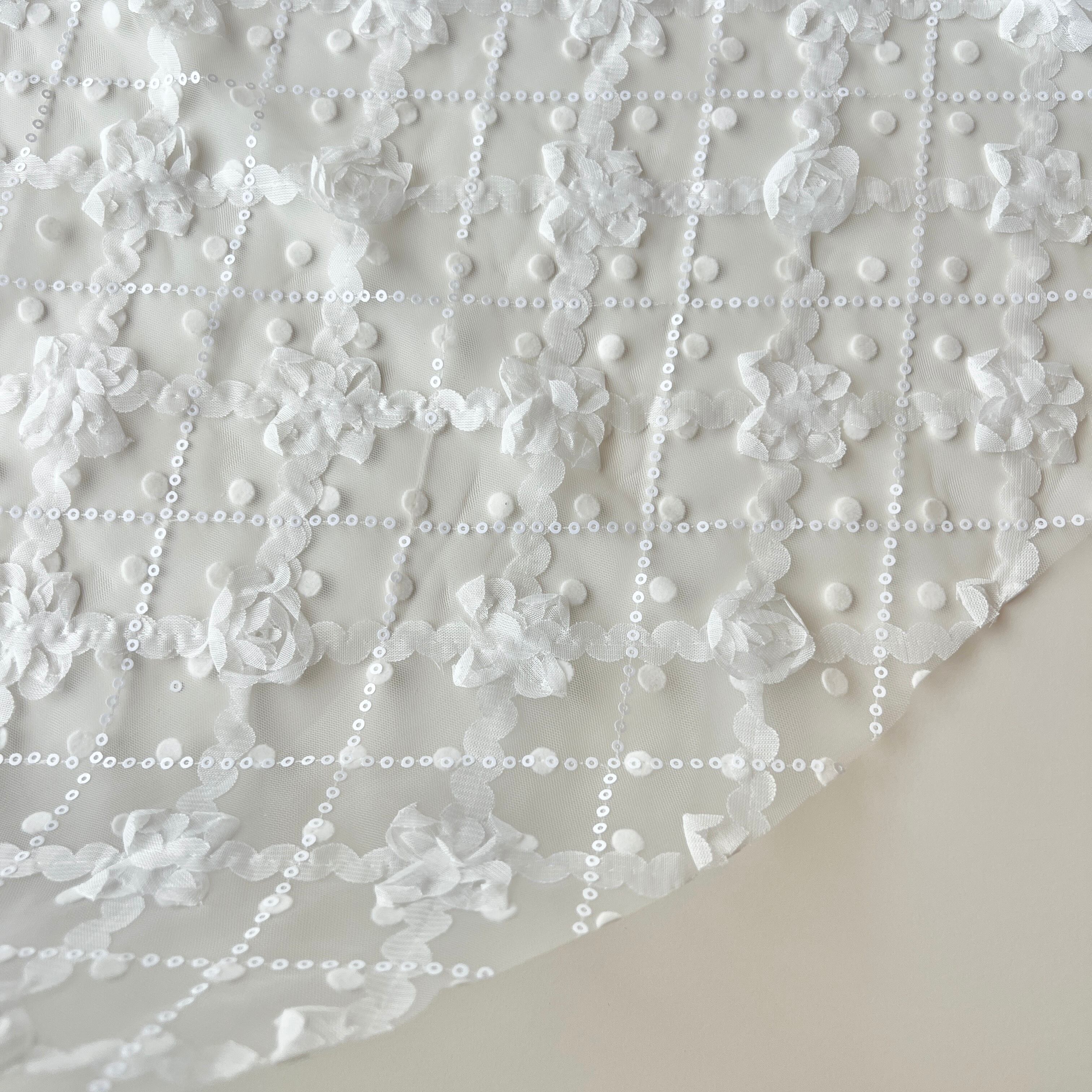 スパンコール入り、ダイヤモンドカットとローズ、そしてドットの入った、とっても可愛いレース生地です。