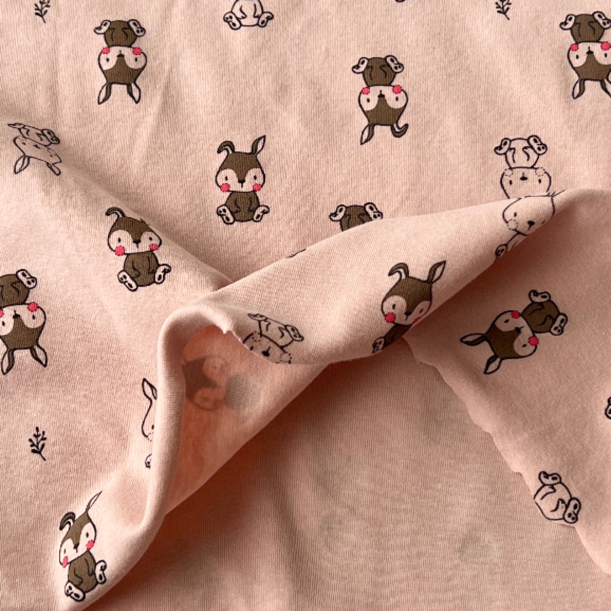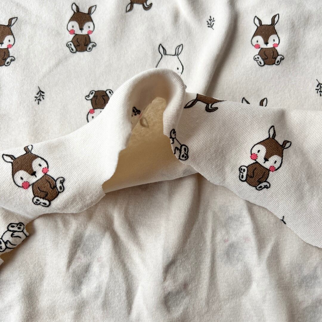 こちらは、ウサギとボタニカルリーフが描かれた40フライスのニット生地となります♪