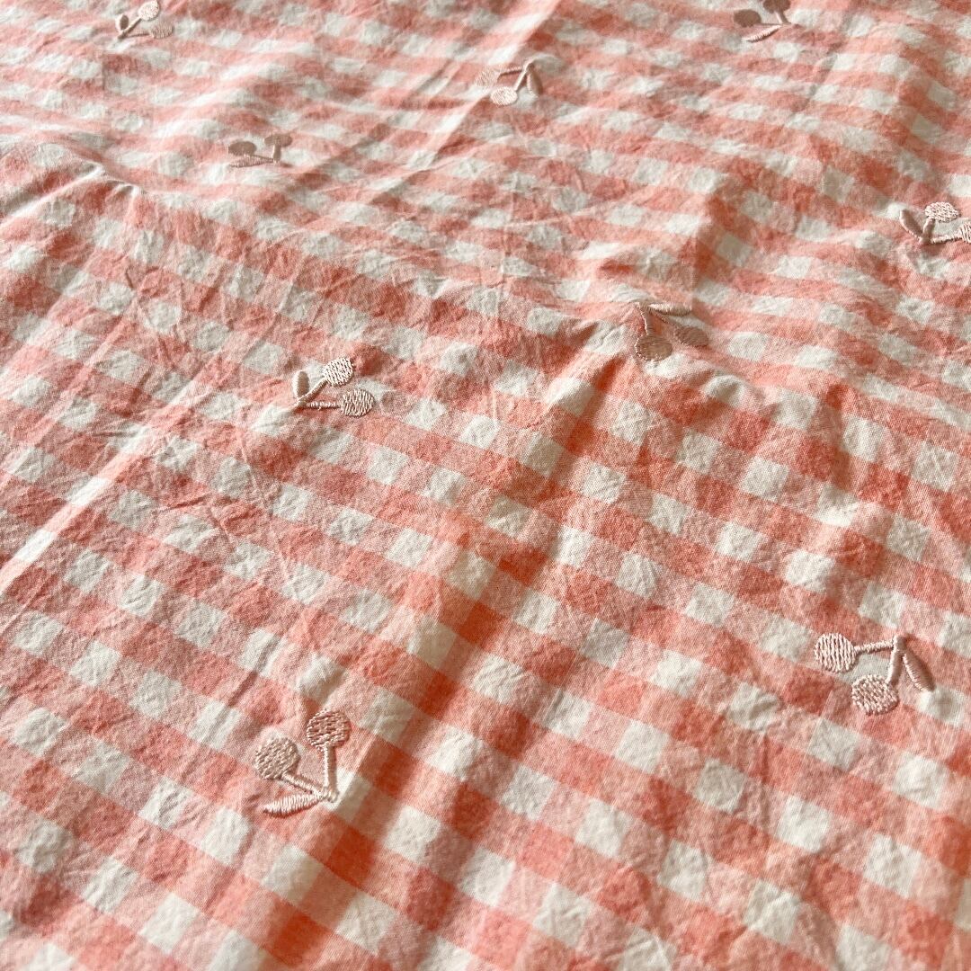ギンガムチェックの生地にチェリーの刺繍をいれたcotton刺繍生地です。