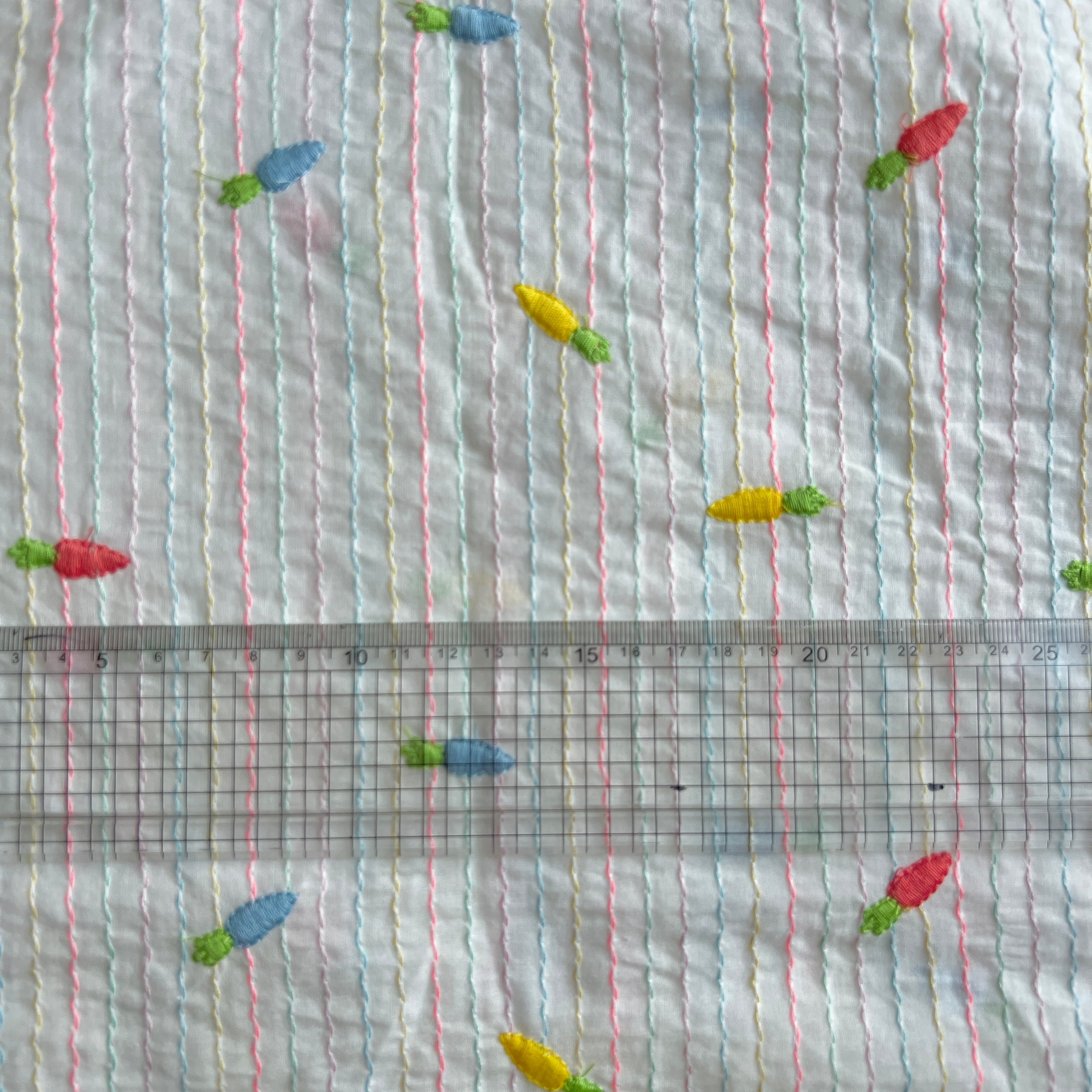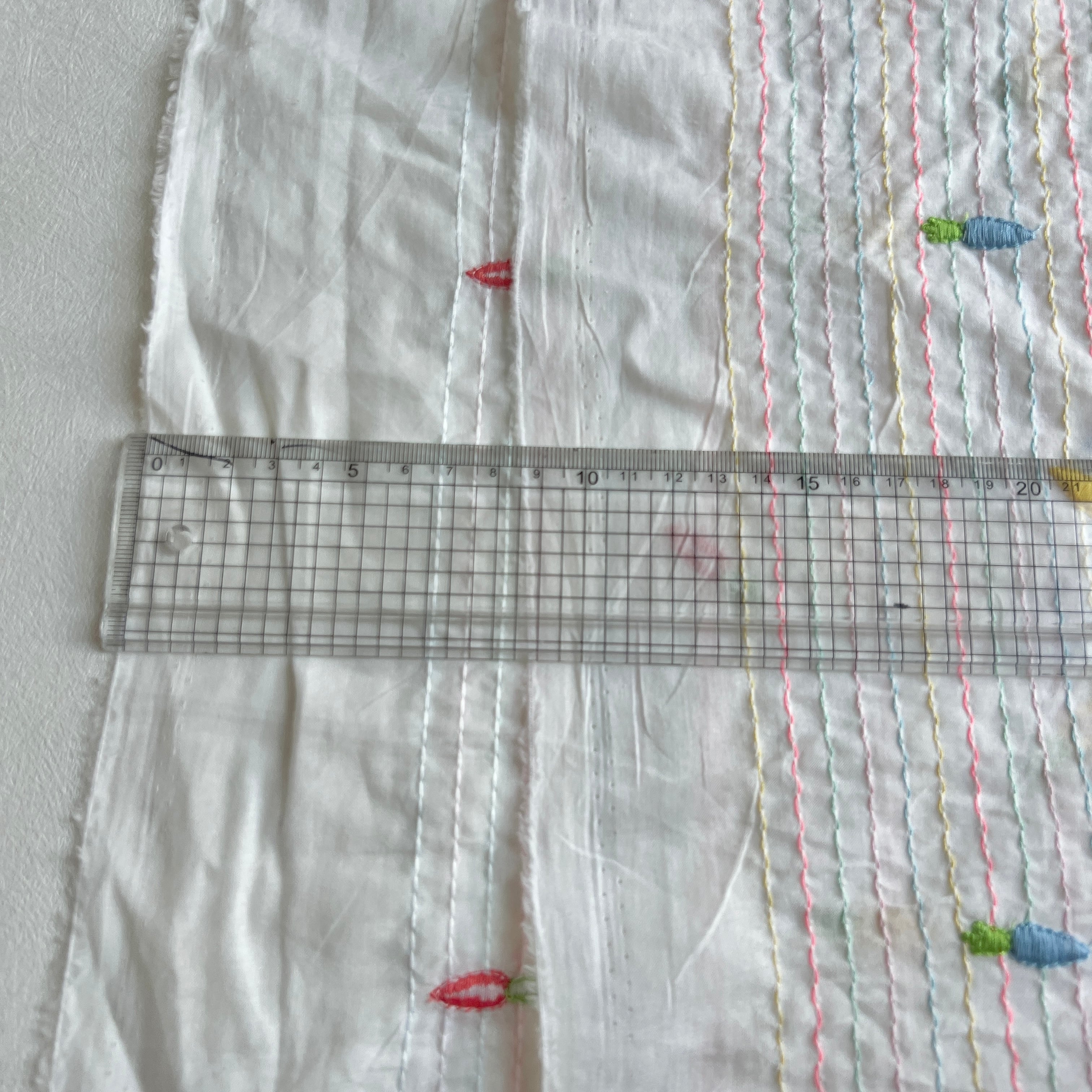 色とりどりのカラフルなストライプにキャロット刺繍が入ったcotton生地です。