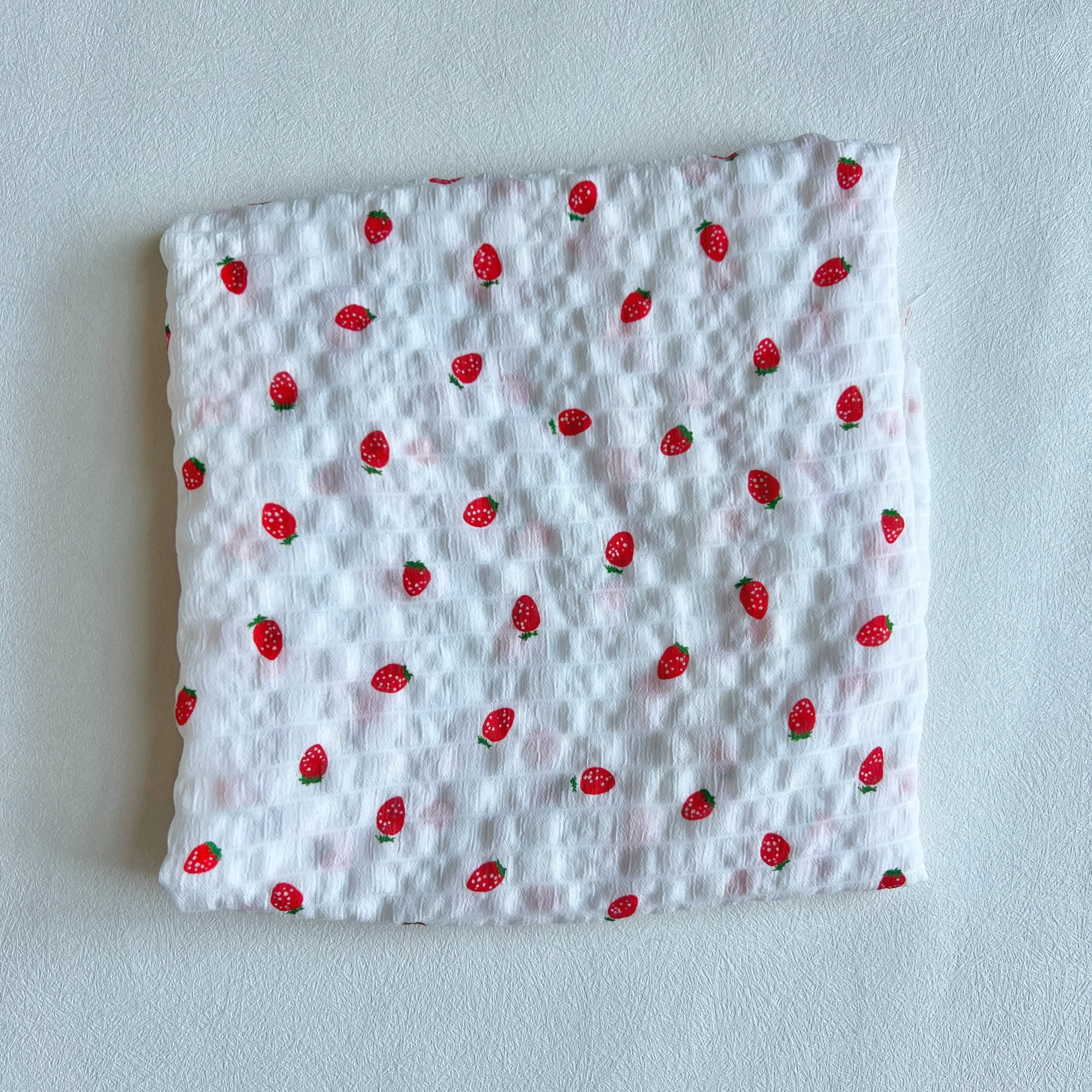 涼しげなポコポコのリップル生地に小粒のいちごのイラストが沢山入ってます。