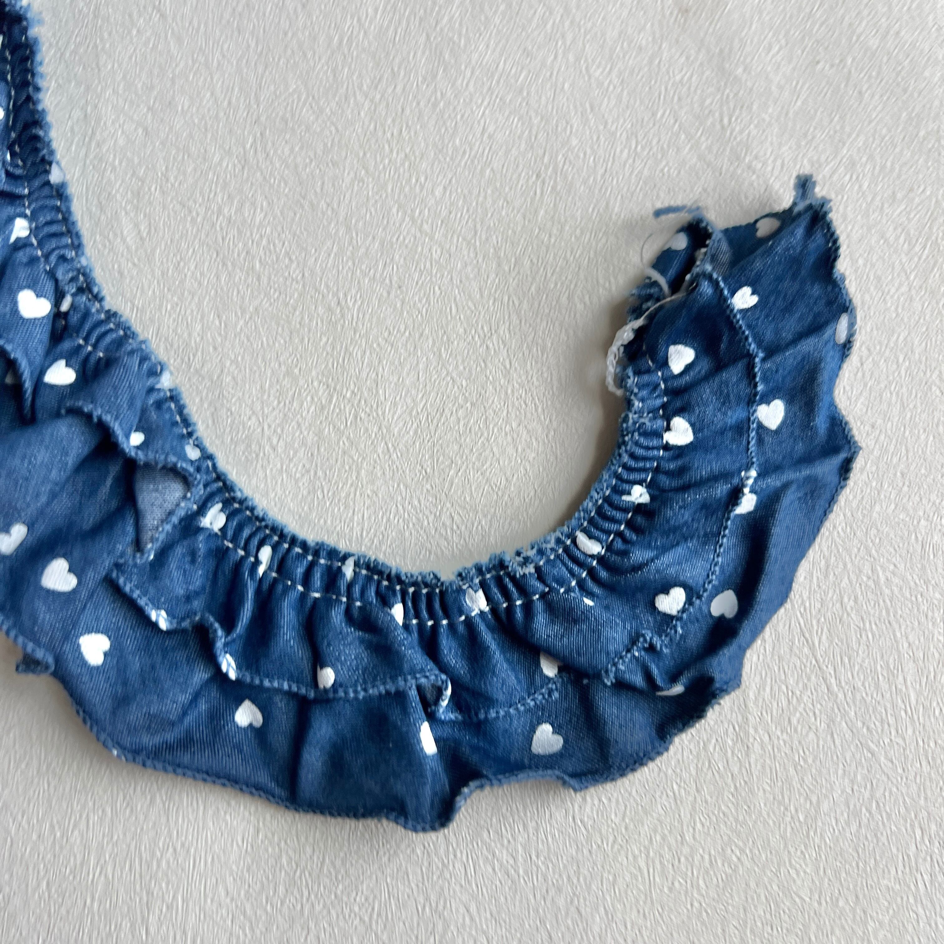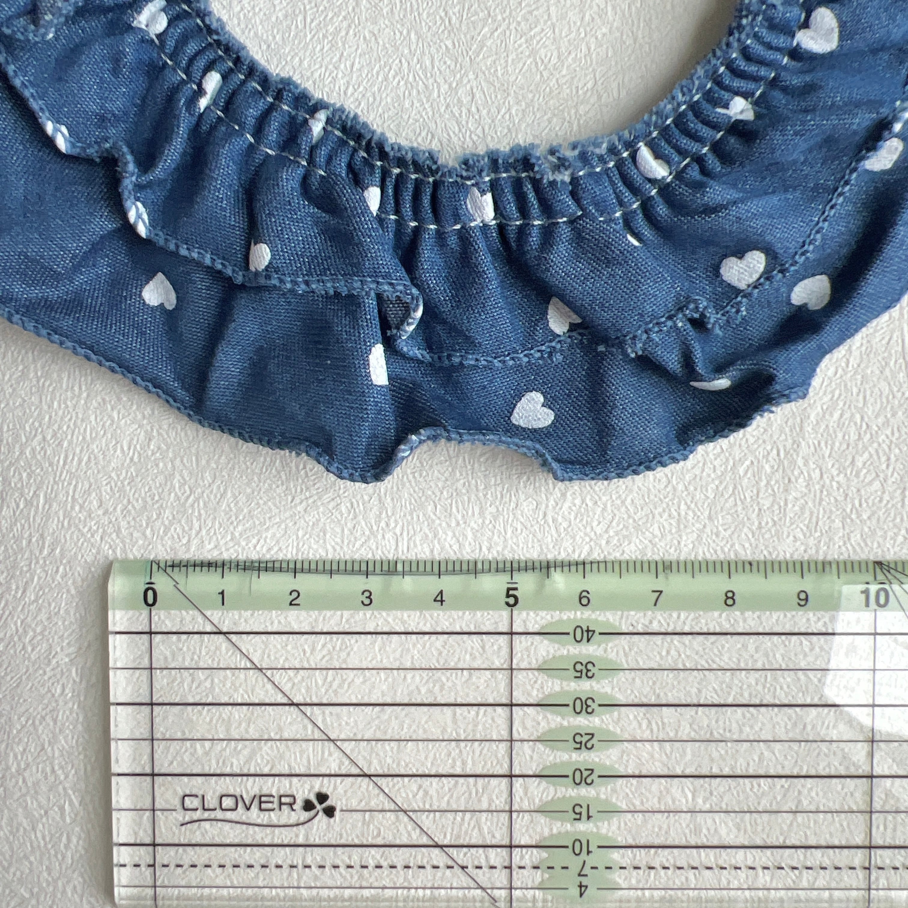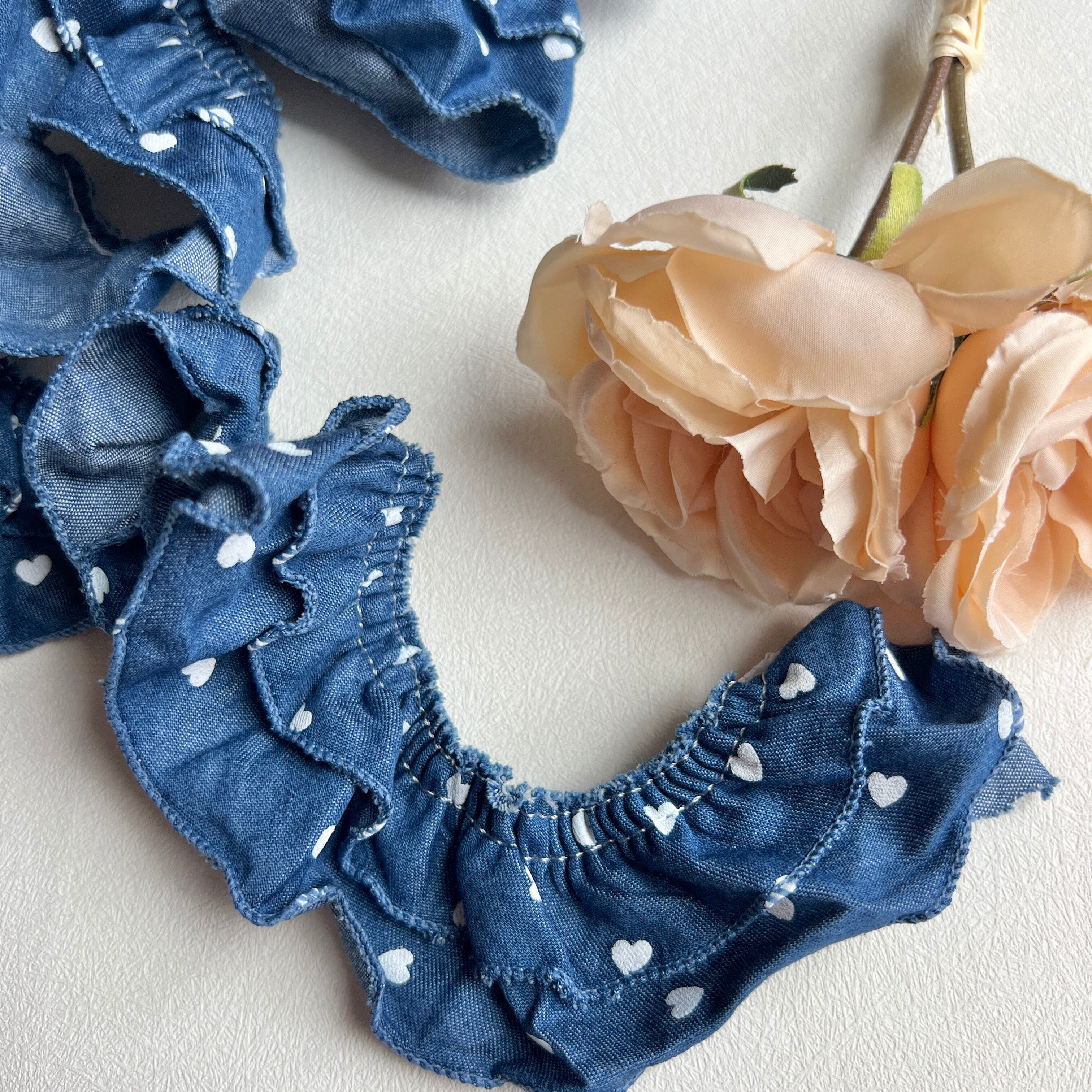 大人気のデニム生地ハート柄で二段タイプのフリルリボンを製作しました。