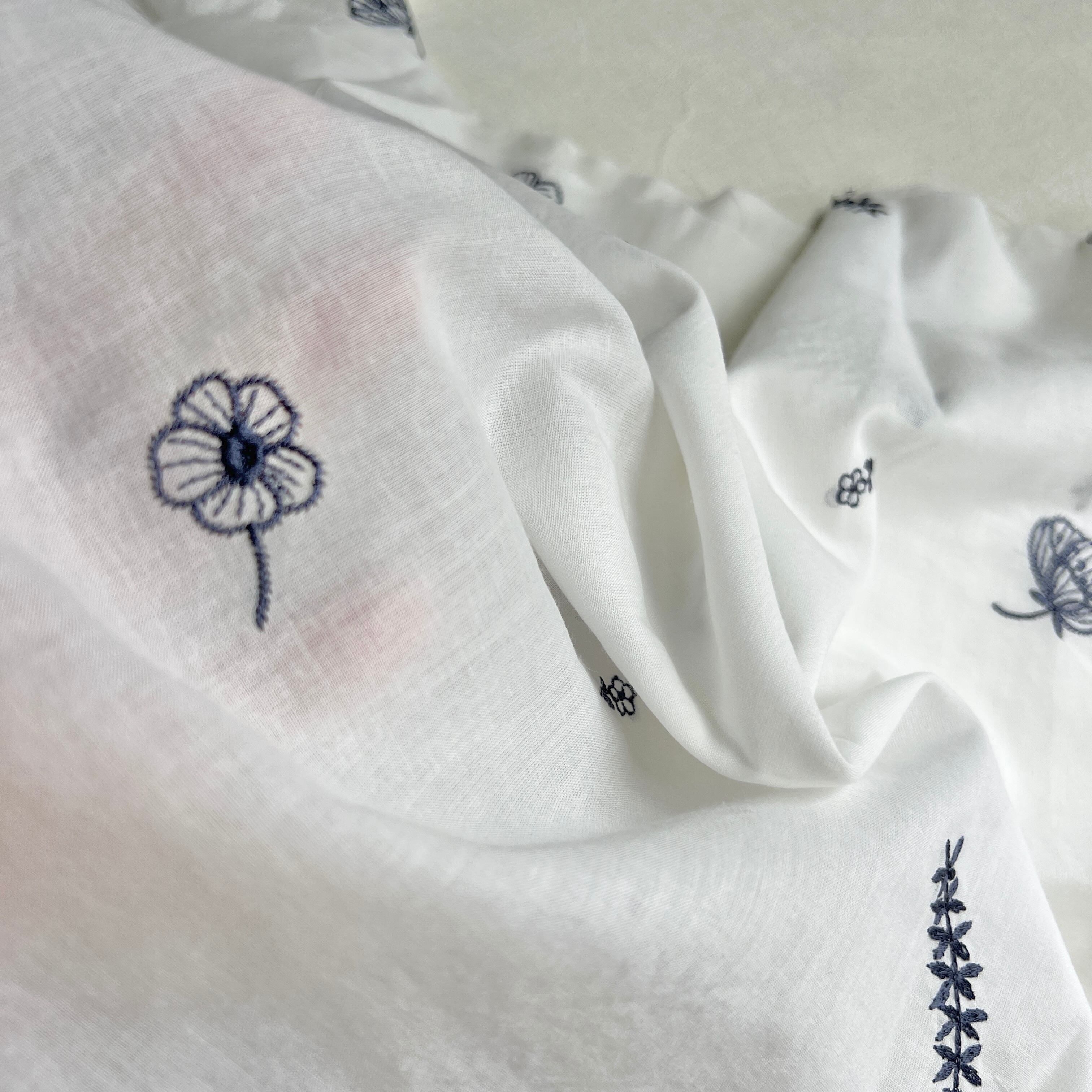 チャコールグレーの糸を使った可愛らしい草と花の刺繍が入ったcotton刺繍生地です。
