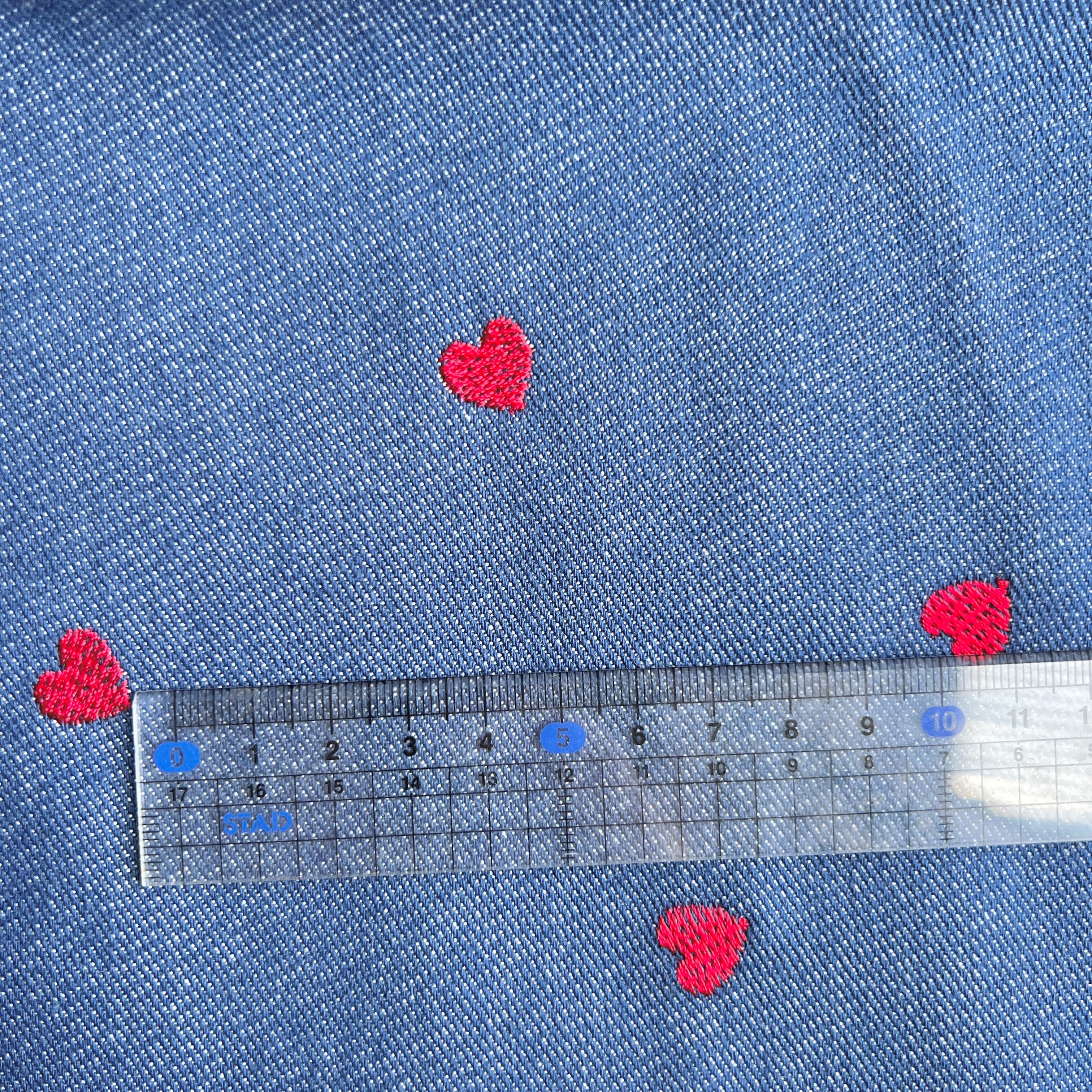 定番のデニム生地にオリジナル刺繍のミニハート刺繍を施した生地です。